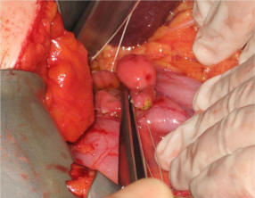 In den bulbus duodeni perforiertes florides ulcus ventrikuli mit stattgehabter blutung aus dem randbereich des ulcus.